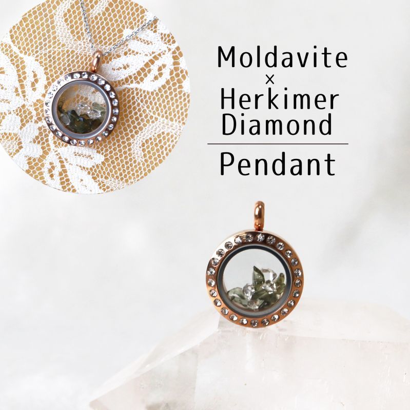 円型の金具ケースにモルダバイト×ハーキマーダイヤモンドの細石を閉じ込めたペンダントトップです。