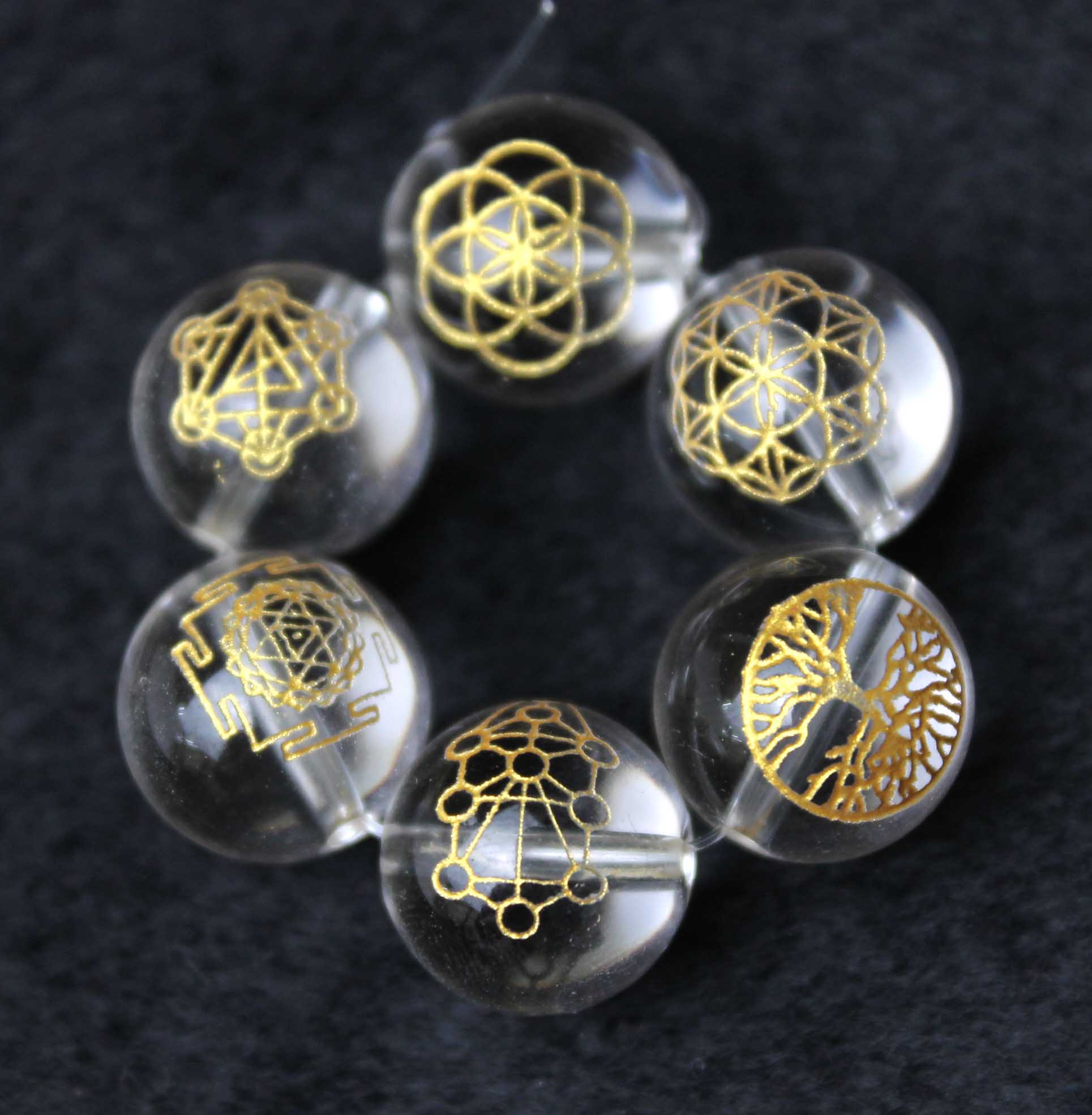 彫刻ビーズ 神聖幾何学模様(金彫) 6種セット 水晶 丸 [be-g0002]