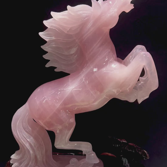 ローズクォーツの柔らかな発色と馬のエネルギッシュなフォルムが美しく調和し、