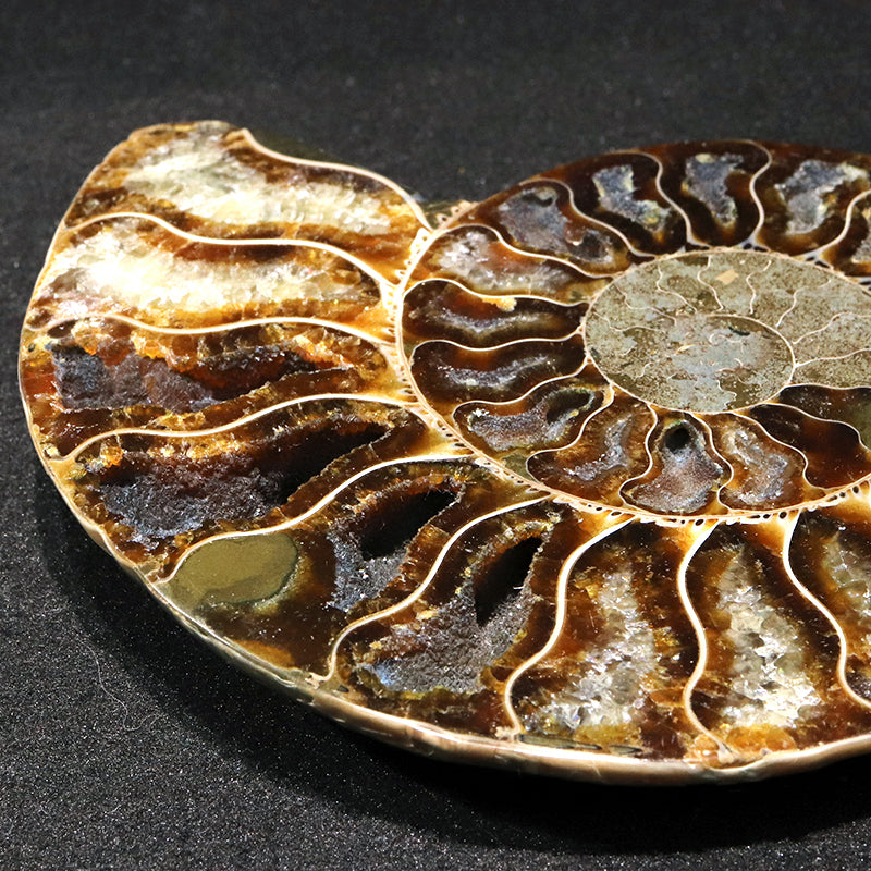 渦巻き状の形が最大の特徴で、内部には隔壁と呼ばれる仕切りが規則正しく形成されており、成長の過程を物語る構造美が評価されています。