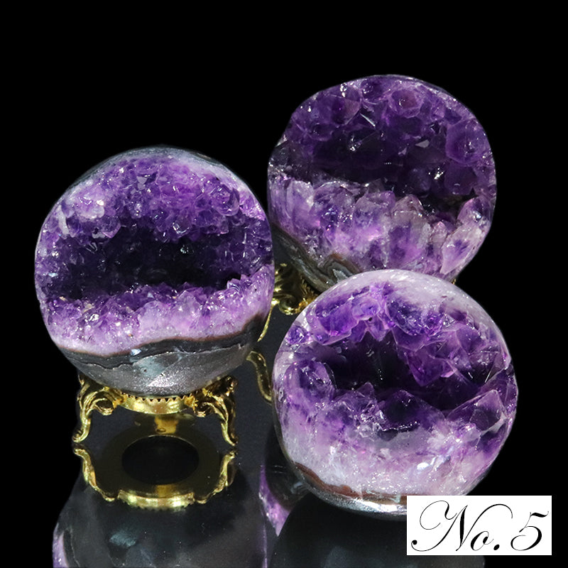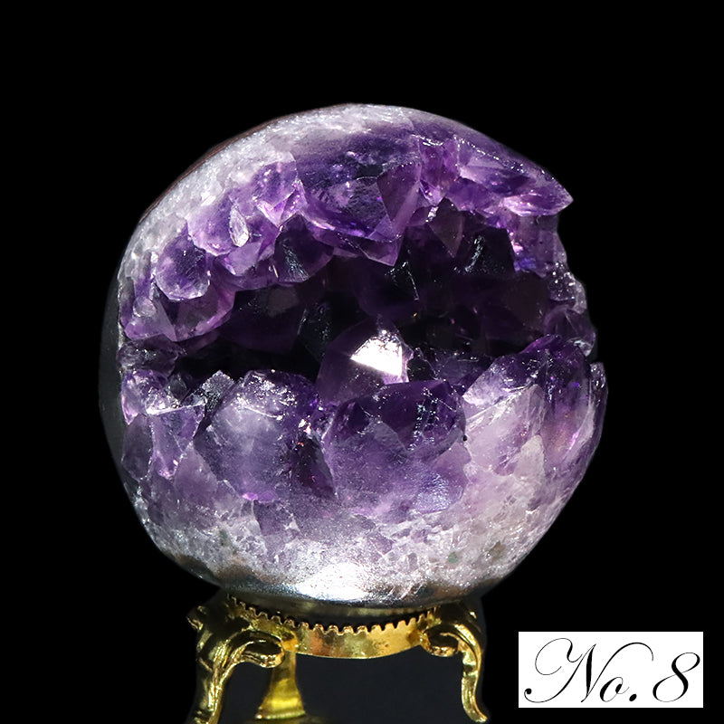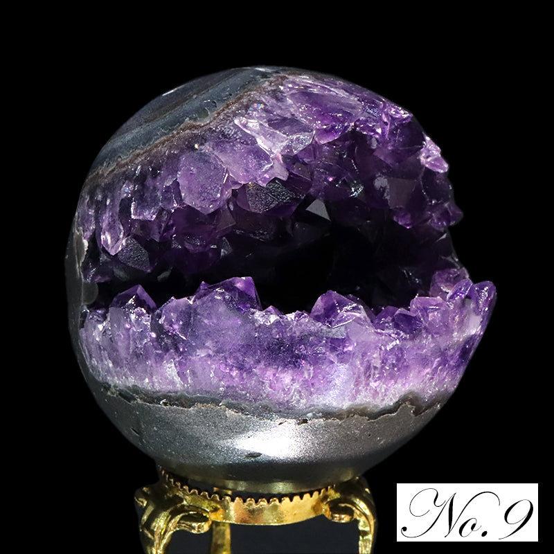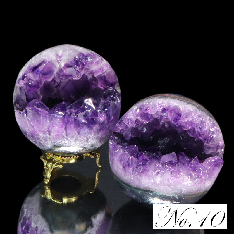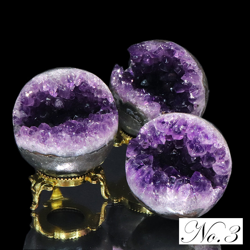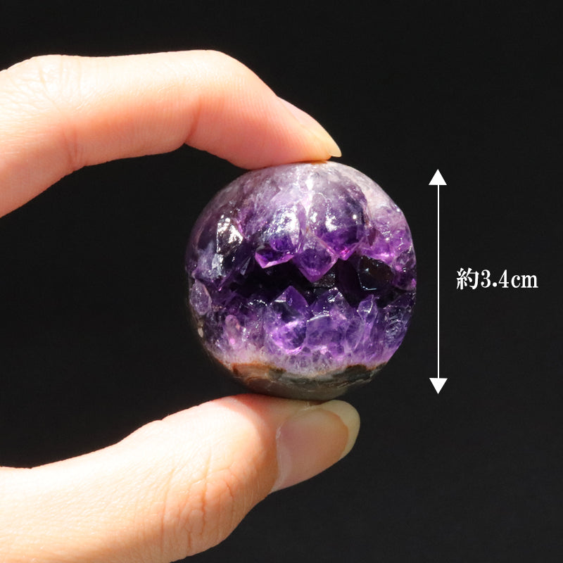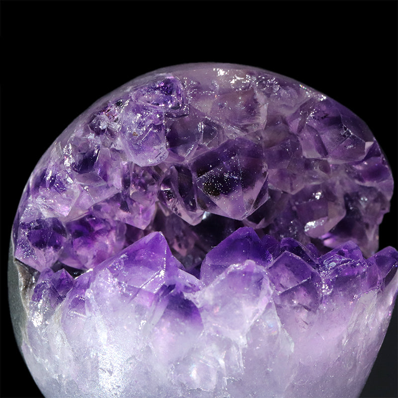 内部には紫色のアメジスト結晶が放射状に成長しており、自然が生み出した空洞構造と結晶の輝きが同時に楽しめる点が大きな特徴です。