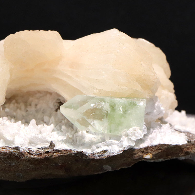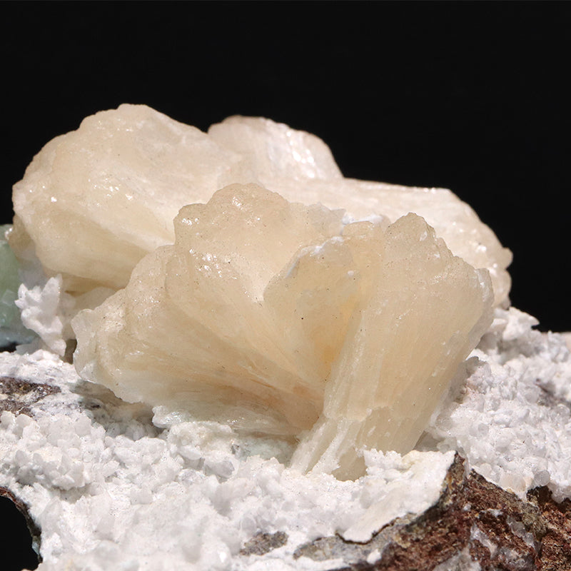 透明感のある結晶と、ガラスのような強い輝きが大きな特徴で、無色透明から白色を中心に、淡い緑色を帯びるものも知られています。