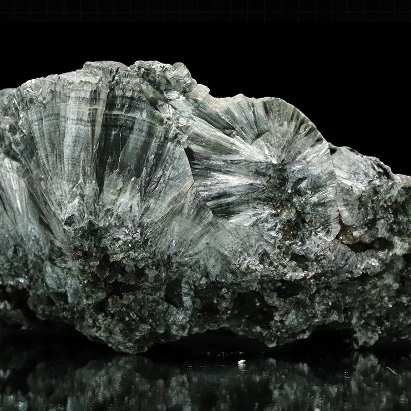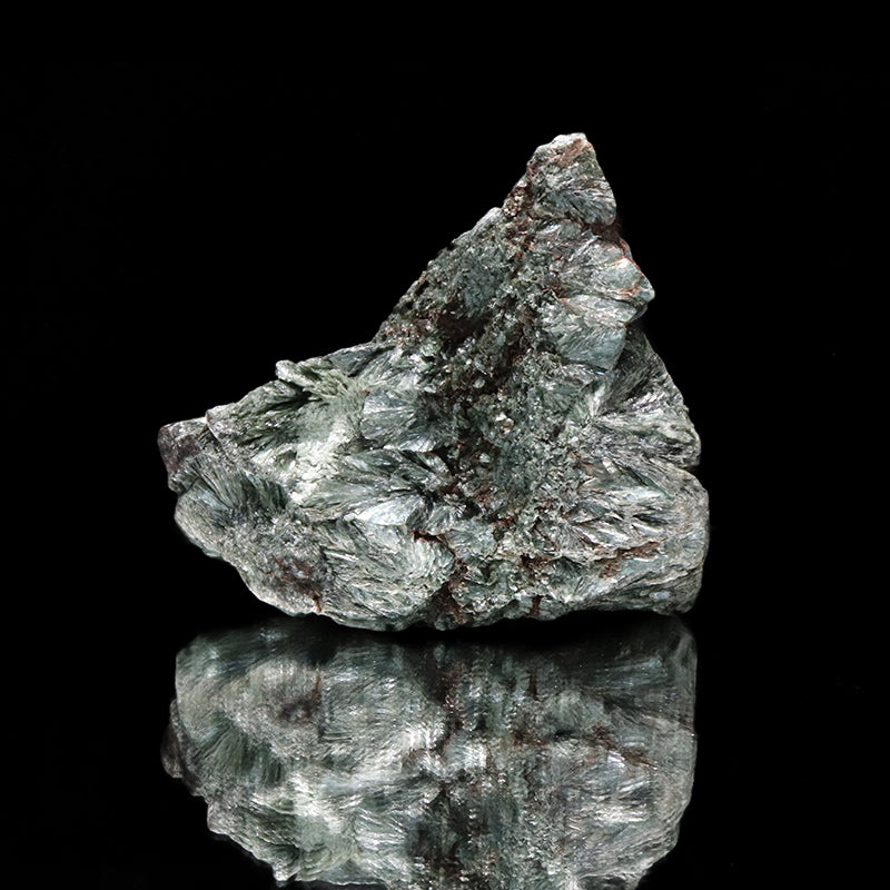 セラフィナイトは、深いグリーンを基調に、羽毛や光の筋のようなシルバーグレーの模様が広がる独特の外観を持つ天然石です。