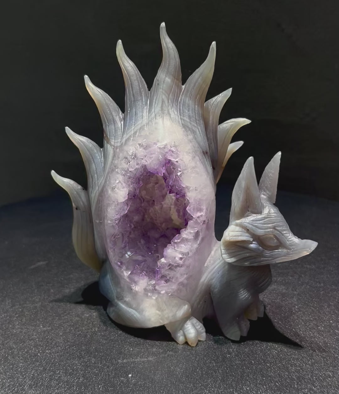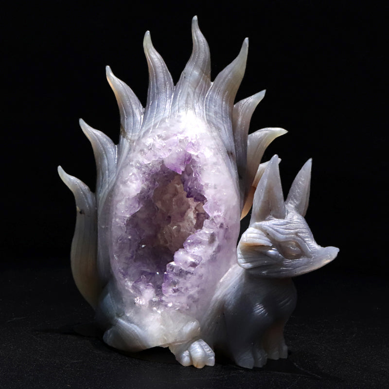 アメジスト特有の透明感と、九尾の狐の流麗な造形が調和し、空間に上品さと神秘の雰囲気をもたらします。