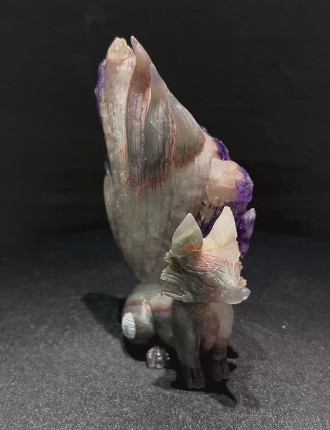 アメジスト特有の透明感と、九尾の狐の流麗な造形が調和し、空間に上品さと神秘の雰囲気をもたらします。