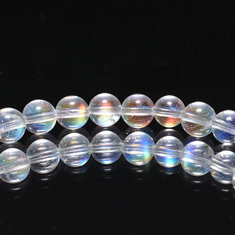 レインボームーンストーンは、角度を変えるたびに青や虹色の光が浮かび上がる“シラー”が最大の魅力です。