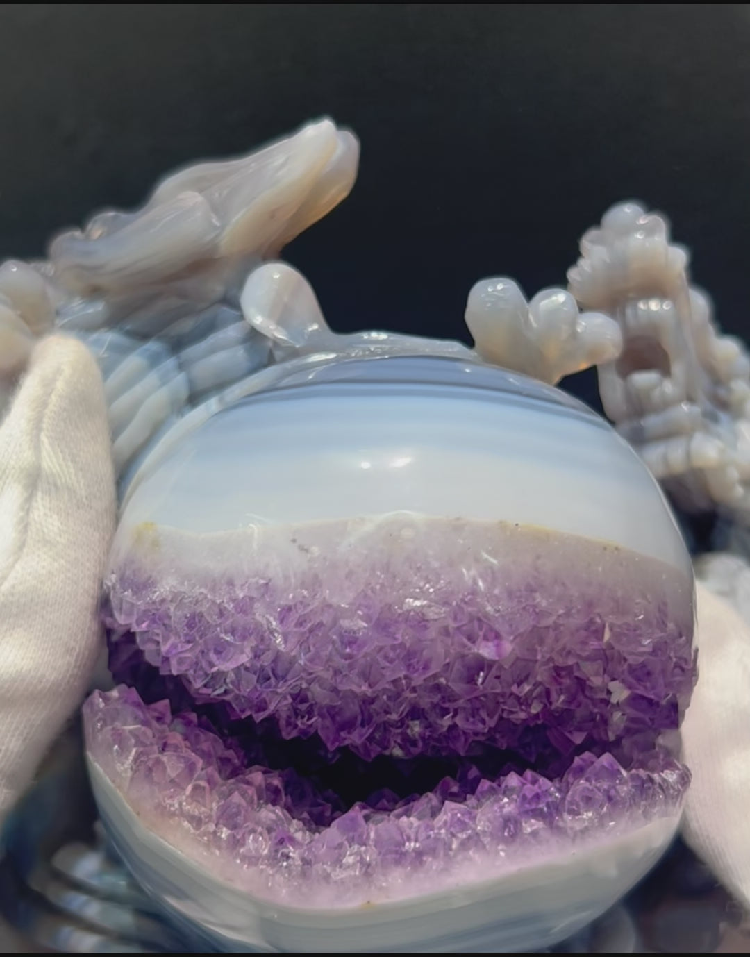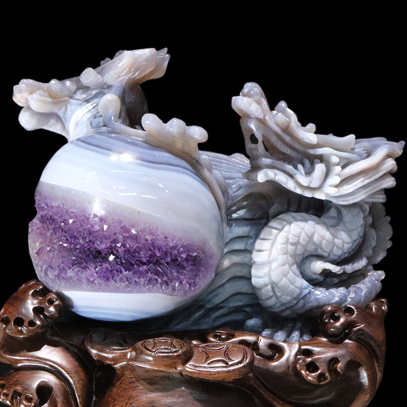 写真では伝えきれない笑口アメジストの奥行きある輝きと、龍の躍動感あふれる彫刻美。