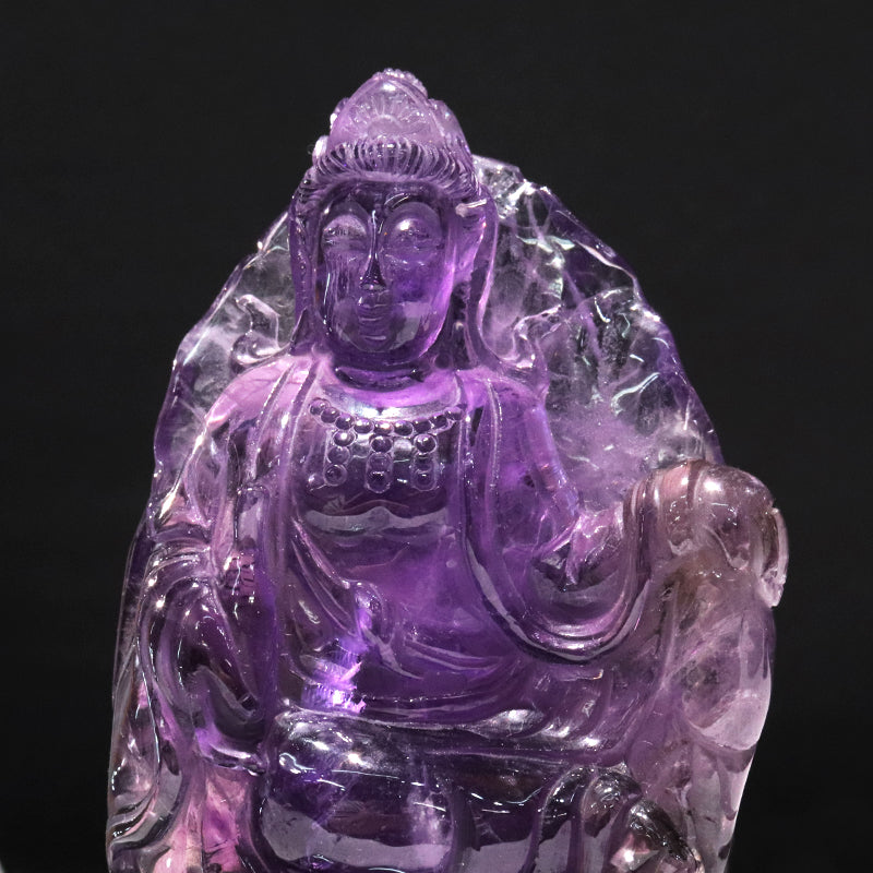 神秘的なアメジストの紫の輝きと、穏やかで優しい表情の観音菩薩の姿が美しく調和し、 眺めるほどに静けさと神聖さを感じさせてくれます。