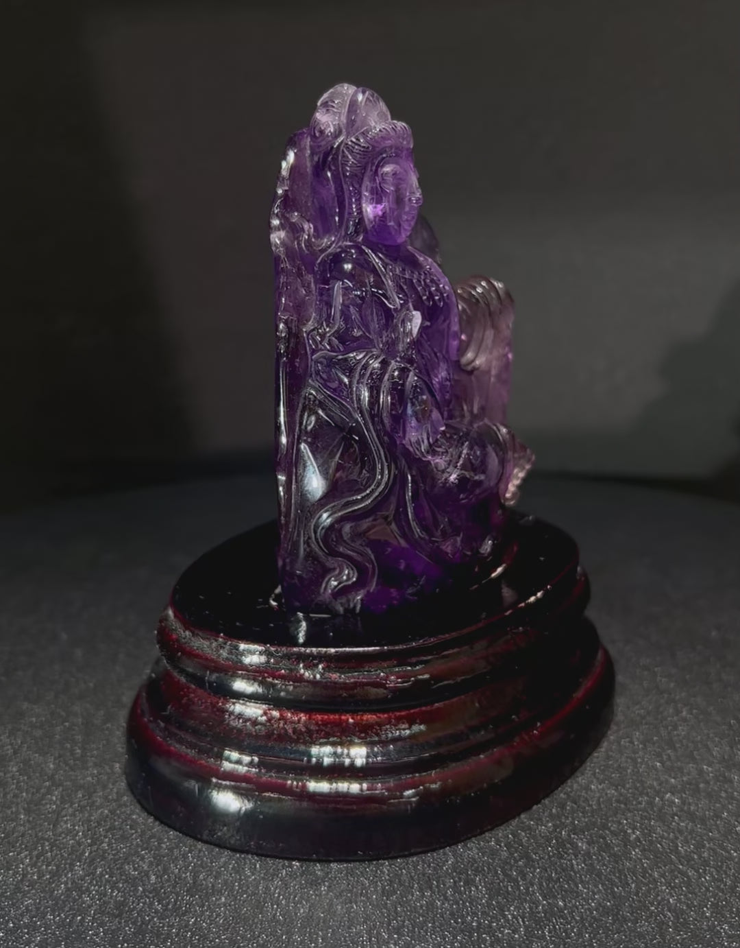 深く美しい紫色をたたえるブラジル産天然アメジストを贅沢に使用し、 慈悲と救済の象徴として古くから信仰されてきた「観音菩薩」を丁寧に彫り上げた一点物の置物です。