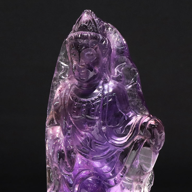 神秘的なアメトリンの紫と黄金の輝きと、穏やかで優しい表情の観音菩薩の姿が美しく調和し、 眺めるほどに静けさと神聖さを感じさせてくれます。