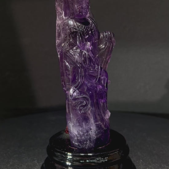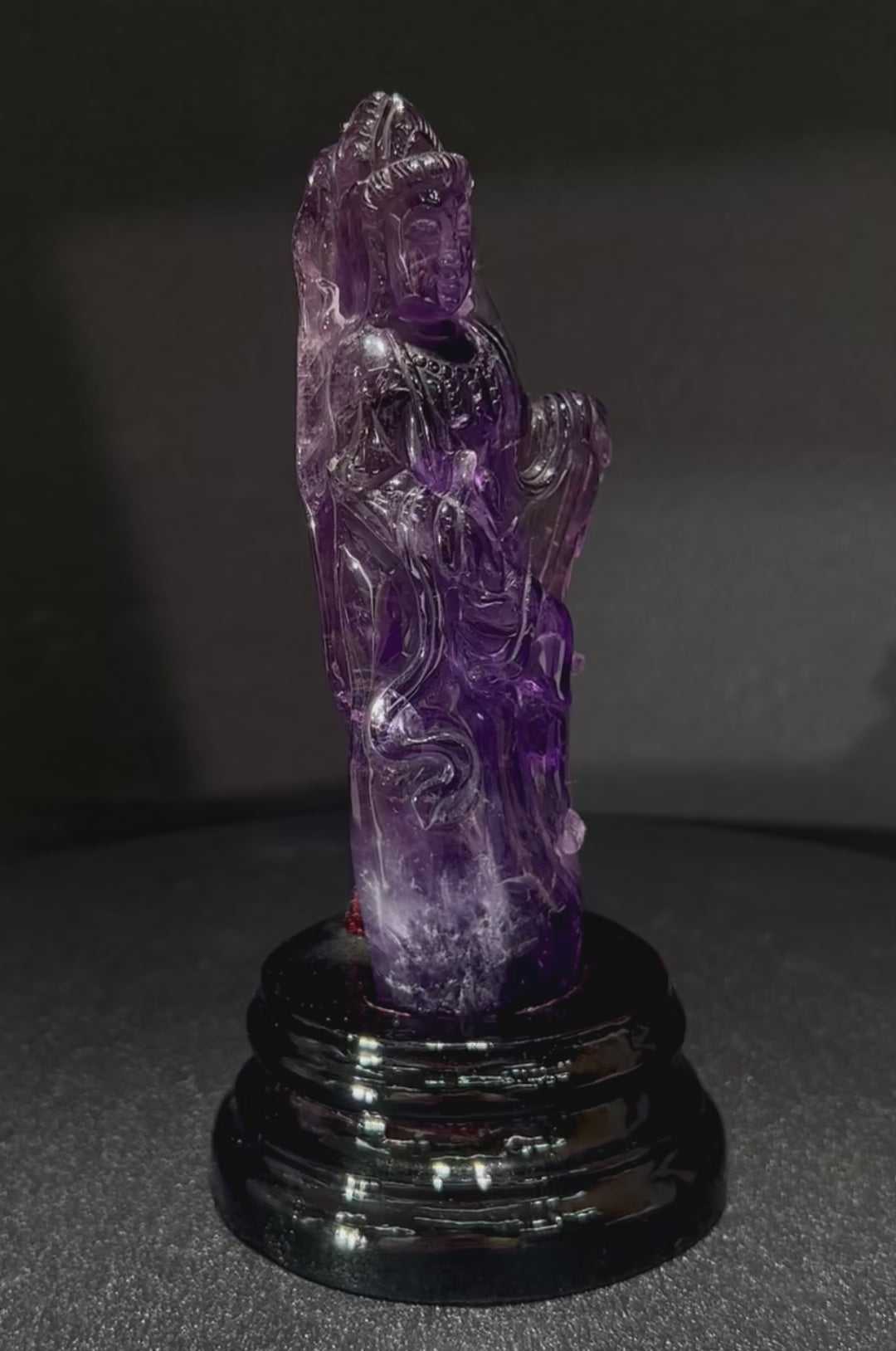 美しい紫と黄金色が織りなすブラジル産天然アメトリンを贅沢に使用し、 慈悲と救済の象徴として古くから信仰されてきた「観音菩薩」を丁寧に彫り上げた一点物の置物です。