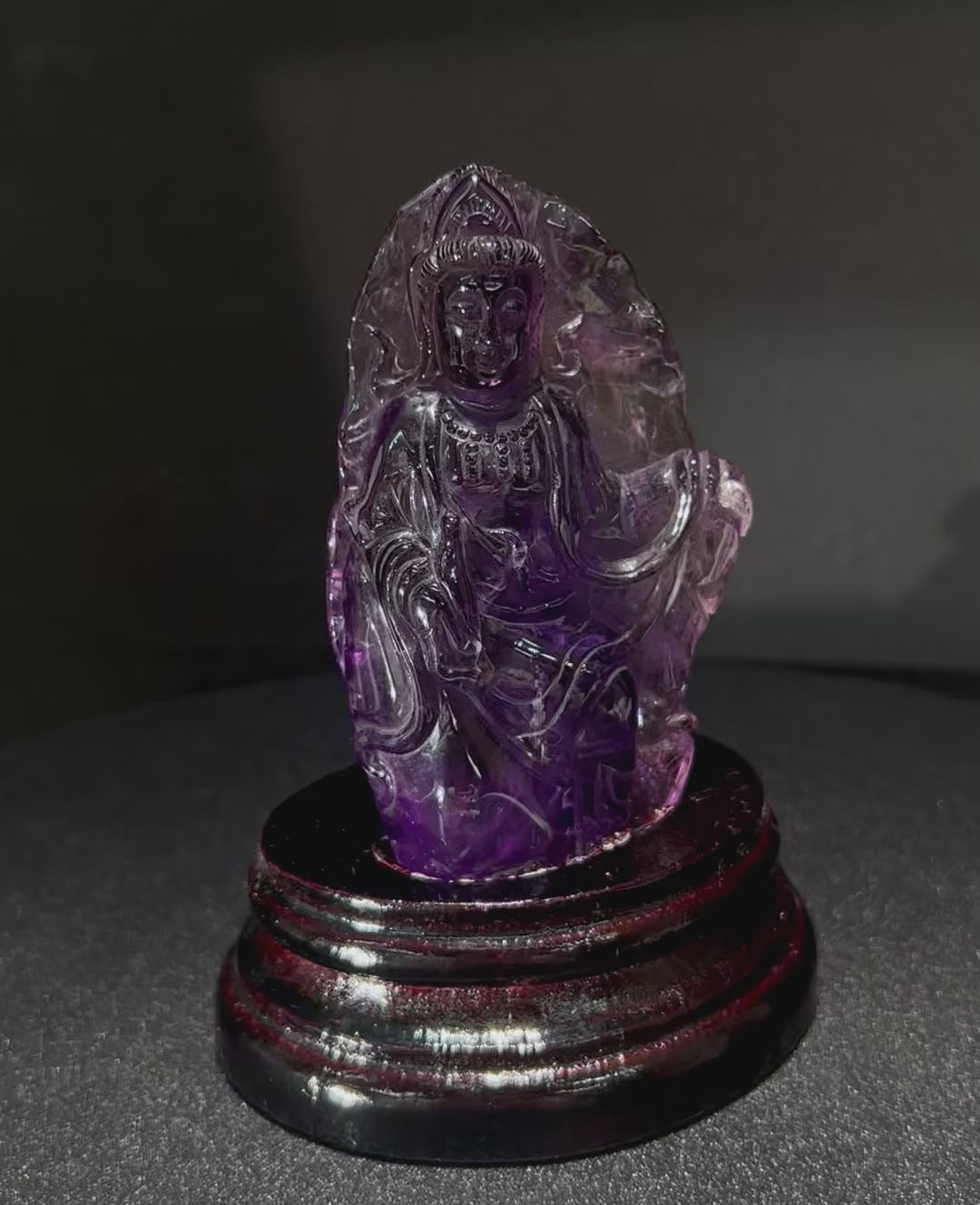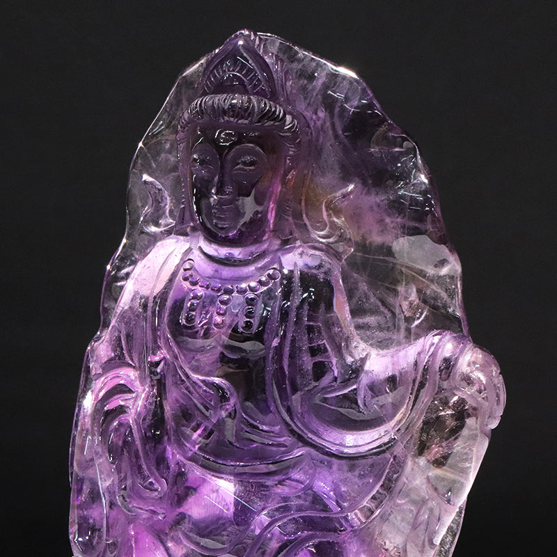 神秘的なアメトリンの紫と黄金の輝きと、穏やかで優しい表情の観音菩薩の姿が美しく調和し、 眺めるほどに静けさと神聖さを感じさせてくれます。