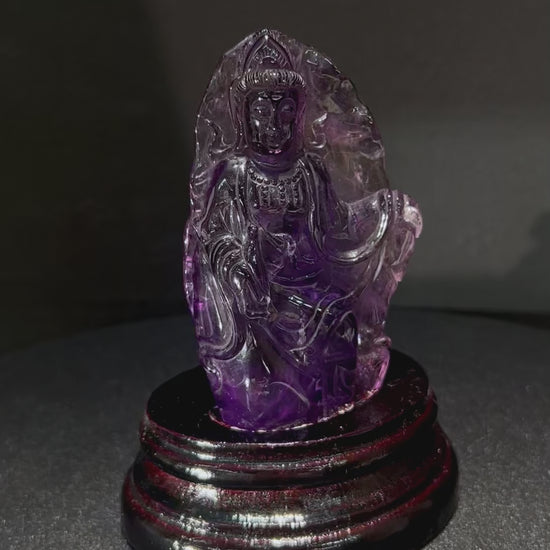 美しい紫と黄金色が織りなすブラジル産天然アメトリンを贅沢に使用し、 慈悲と救済の象徴として古くから信仰されてきた「観音菩薩」を丁寧に彫り上げた一点物の置物です。