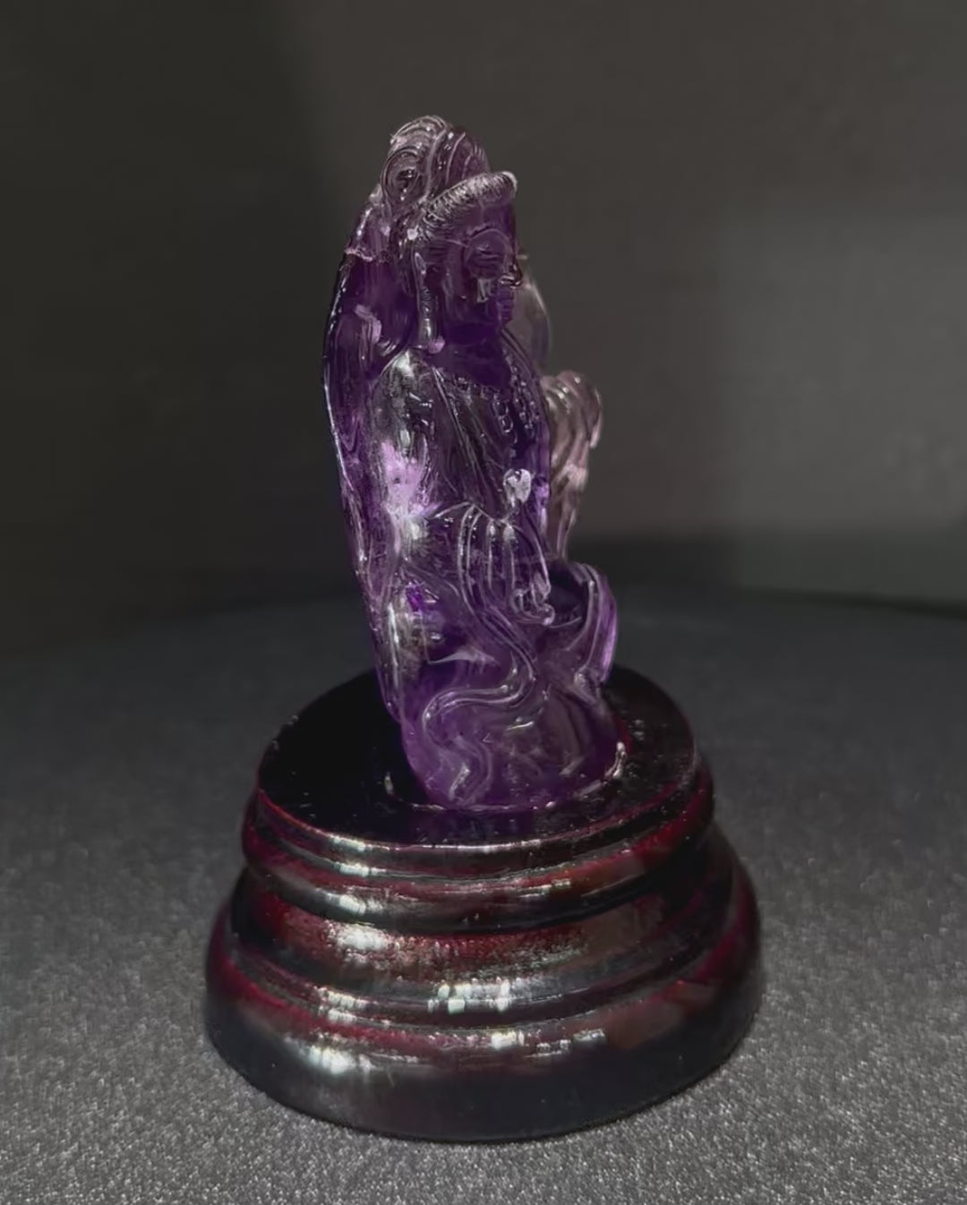 美しい紫と黄金色が織りなすブラジル産天然アメトリンを贅沢に使用し、 慈悲と救済の象徴として古くから信仰されてきた「観音菩薩」を丁寧に彫り上げた一点物の置物です。