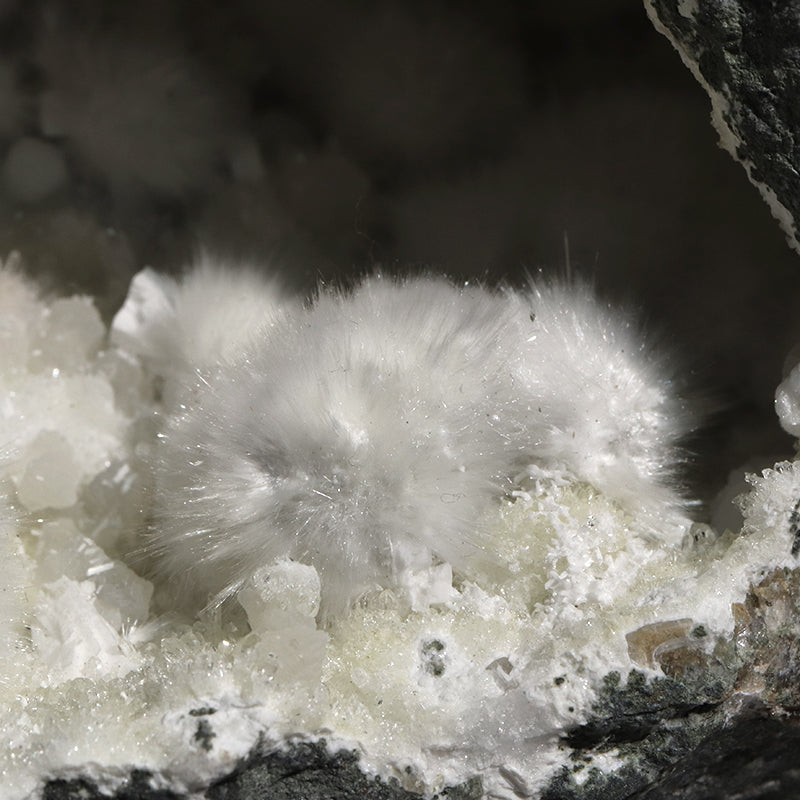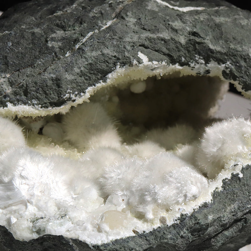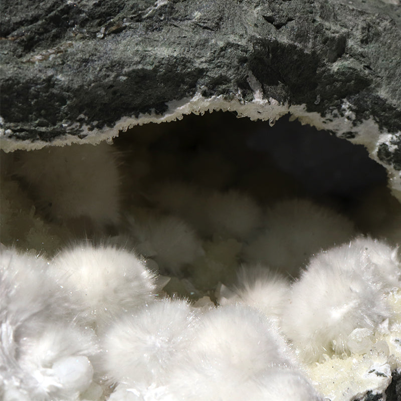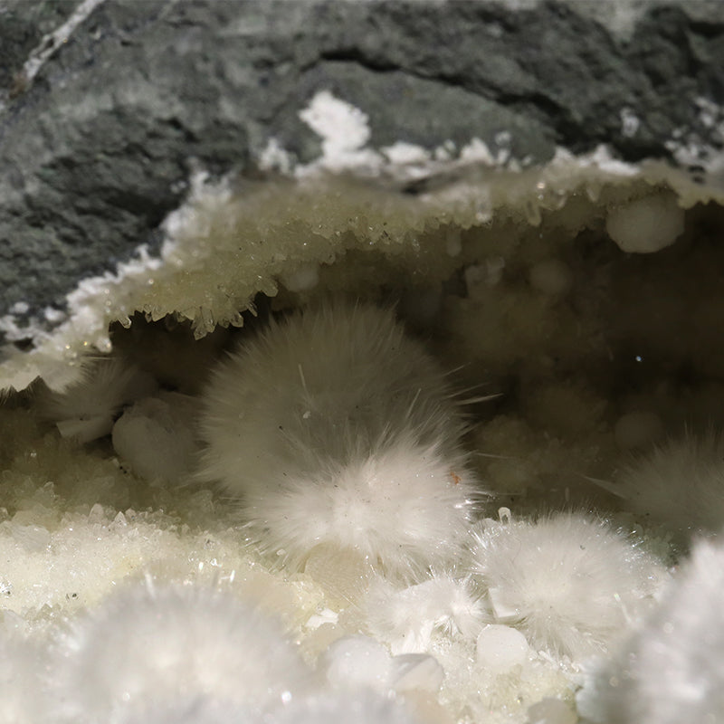 主にインドで産出され、母岩の空洞内に白い球状の結晶として形成されることが多く、その幻想的なビジュアルからコレクター需要も高い鉱物です。