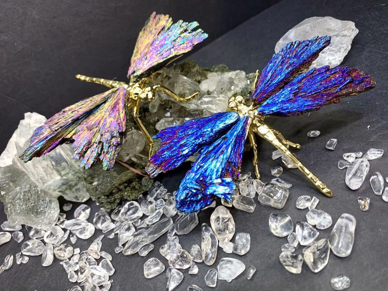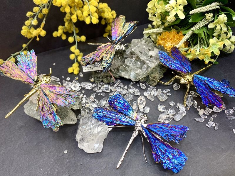 オーラ加工を施したカイヤナイトを使用したトンボの置物です。